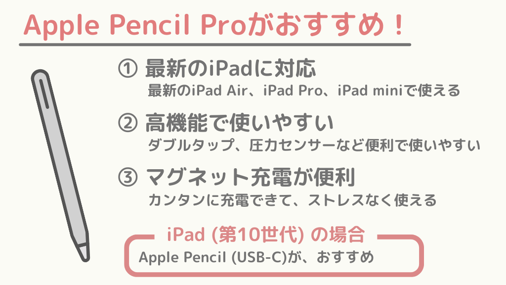 このため、iPad(第10世代)を使用、購入検討している人には、Apple Pencil (USB-C)がおすすめです。