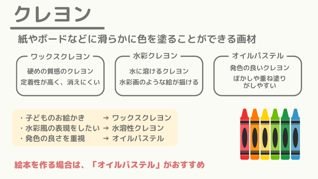 絵本を作る場合は、「オイルパステル」がおすすめです。