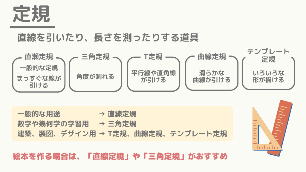 絵本を作る場合は、「直線定規」や「三角定規」がおすすめです。