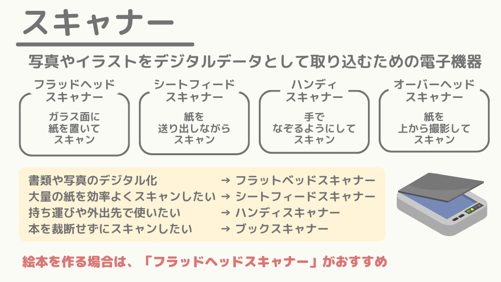 絵本を作る場合は、「フラットベッドスキャナー」がおすすめです。