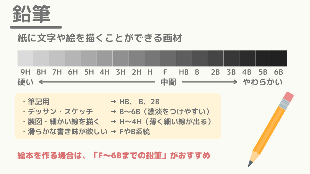 絵本を作る場合は、F〜6Bまでの硬さが適しています。