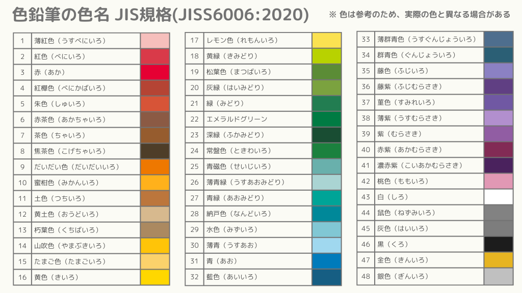 JIS規格(JISS6006:2020)では、色鉛筆の色名は48色が規定されています。