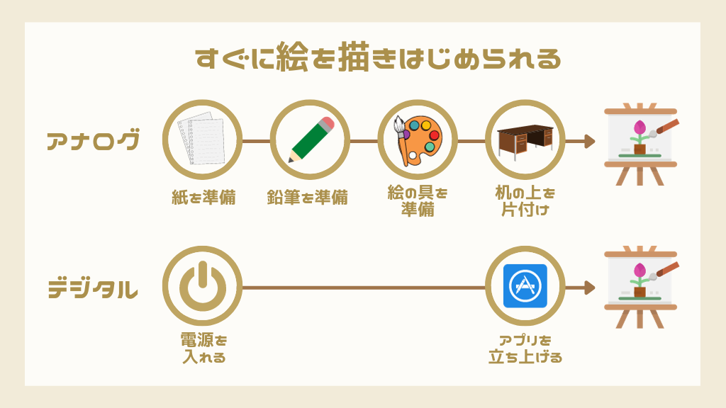 デジタルお絵描きツールは、 「デバイスの電源を入れる」、「アプリケーションを立ち上げる」だけで、すぐに絵を描きはじめることができます。