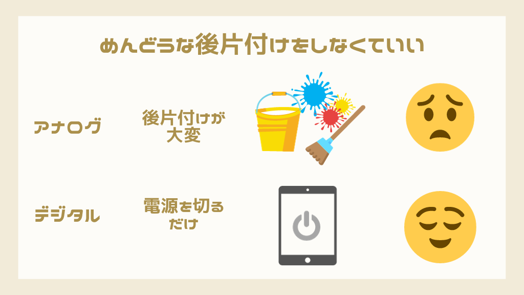 デジタルお絵描きツールでお絵描きが終わったあとは、「ファイルを保存する」、「アプリケーションを終了する」、「電源を切る」という操作だけでカンタンに片付けが終わります。