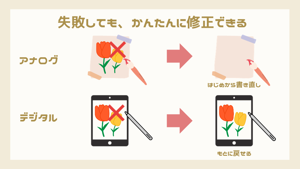 デジタルお絵描きツールには、次の2つのメリットがあります。