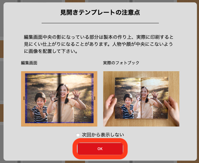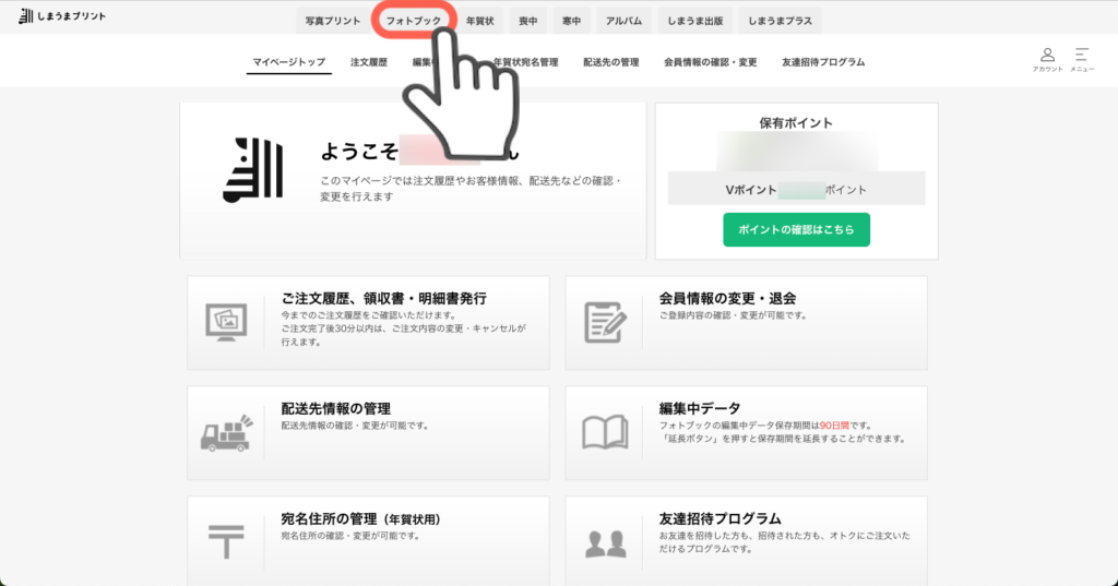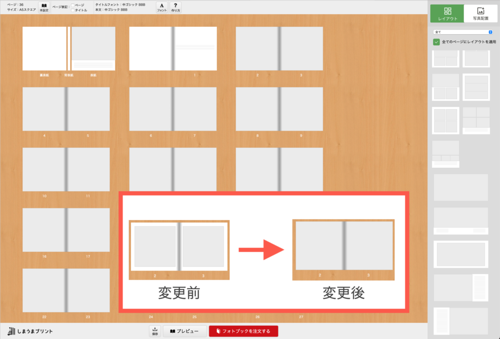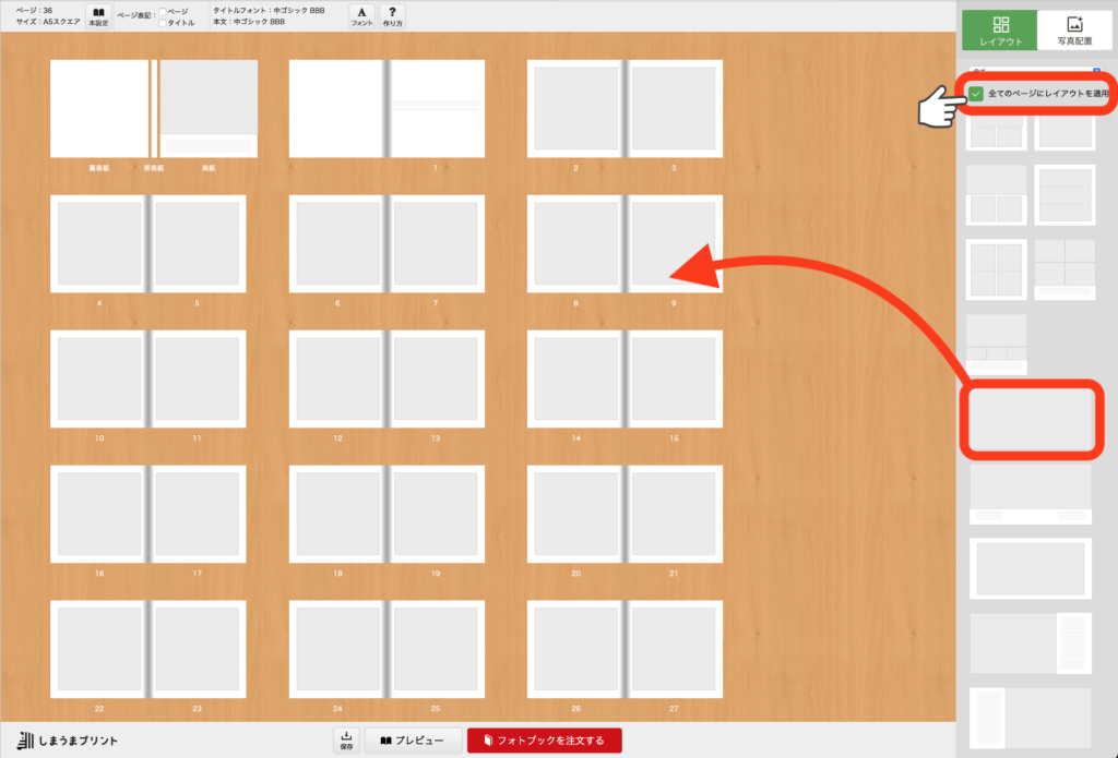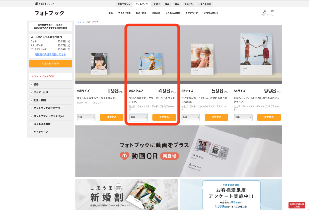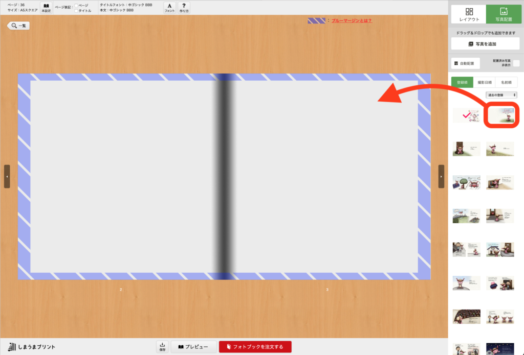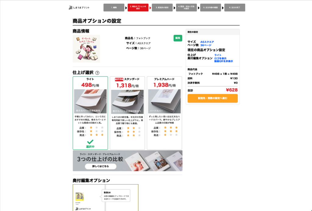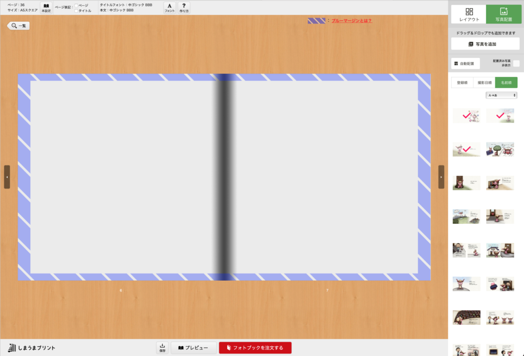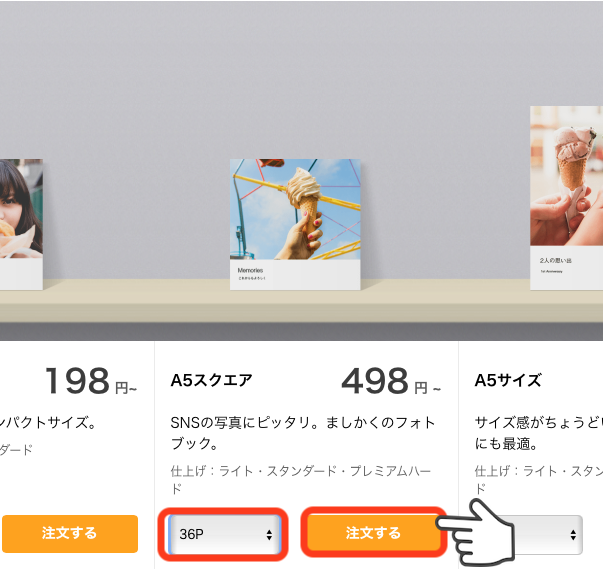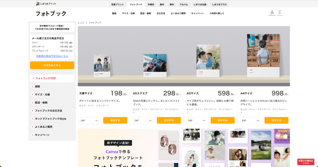 「フォトブックを注文する」をクリックすると、フォトブックの注文画面が表示されます。