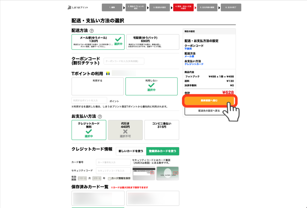 配送先の設定が完了したら、「配送・支払い方法の選択へ進む」をクリックします。