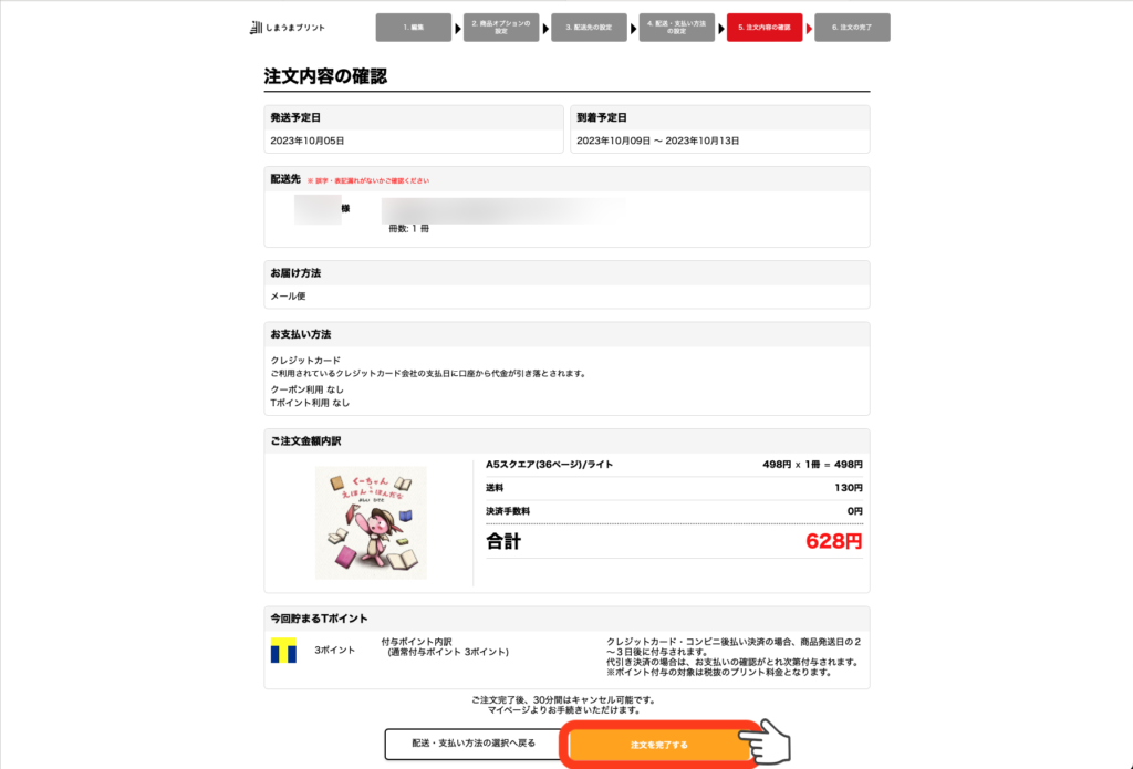 間違いがなければ、「注文を完了する」ボタンをクリックします。