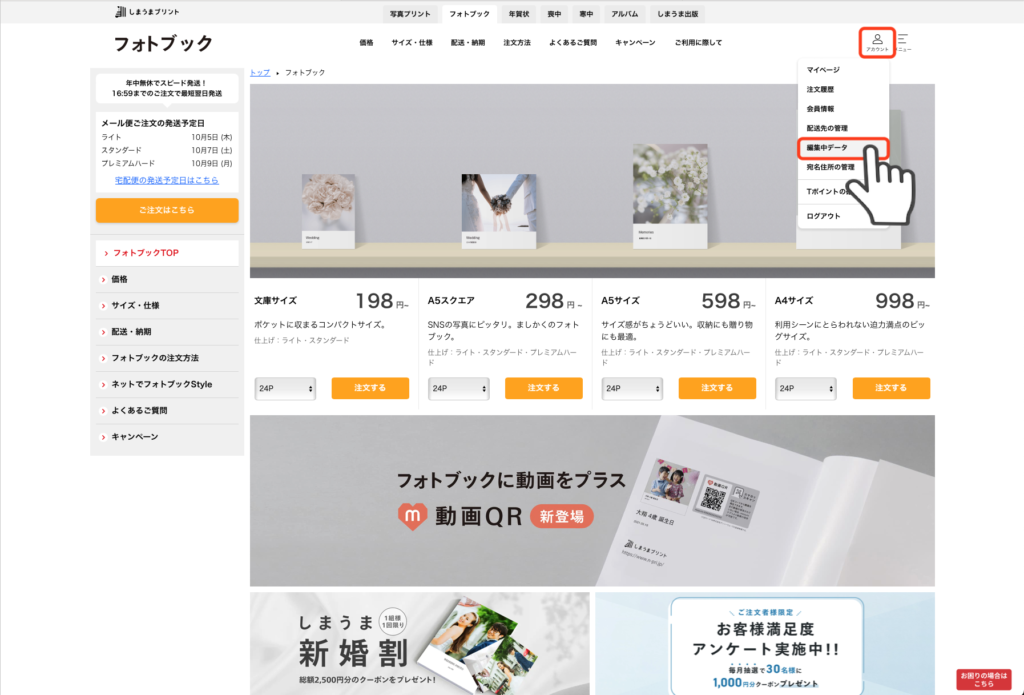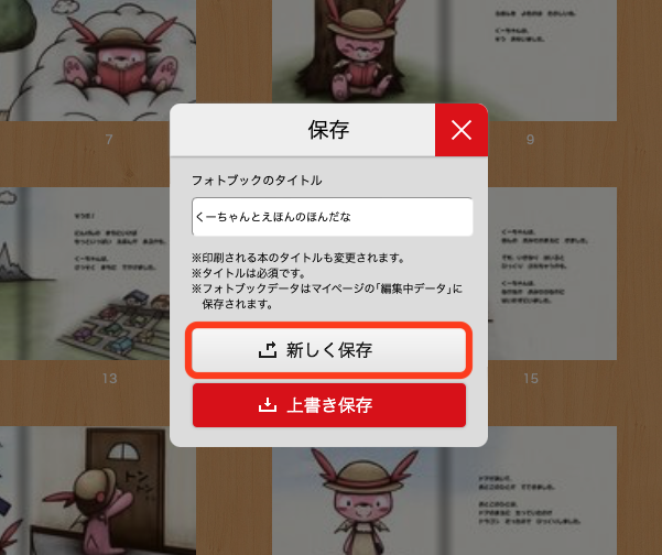 しまうまプリントのフォトブックの保存機能は、作成中のフォトブックを保存できる機能です。
