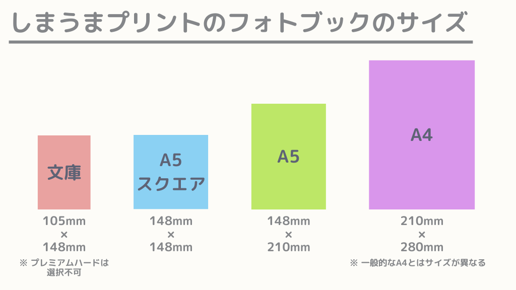 しまうまプリントのフォトブックには、次の4つのサイズがあります。