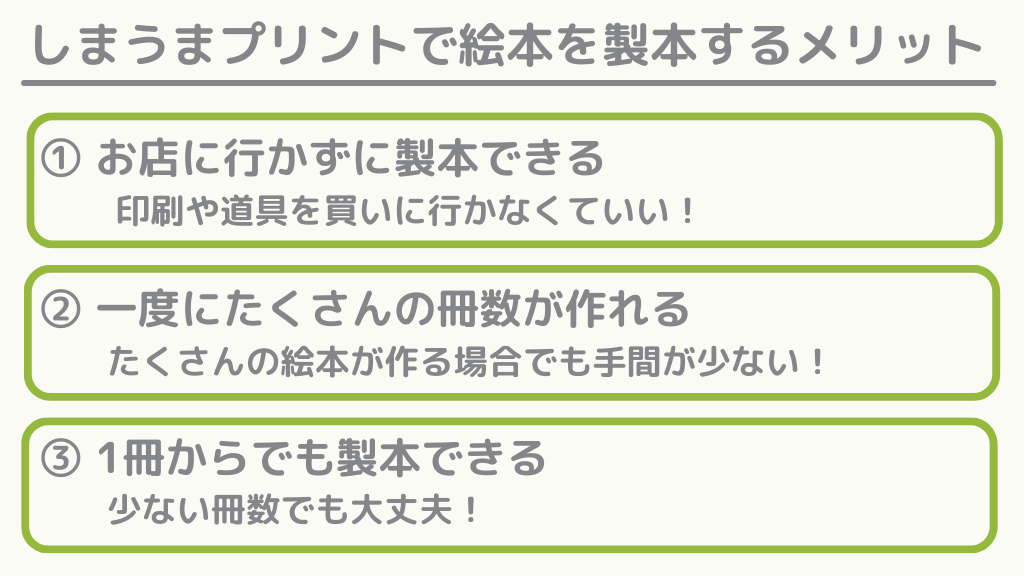 しまうまプリントで絵本を製本するメリットは、次の3つです。