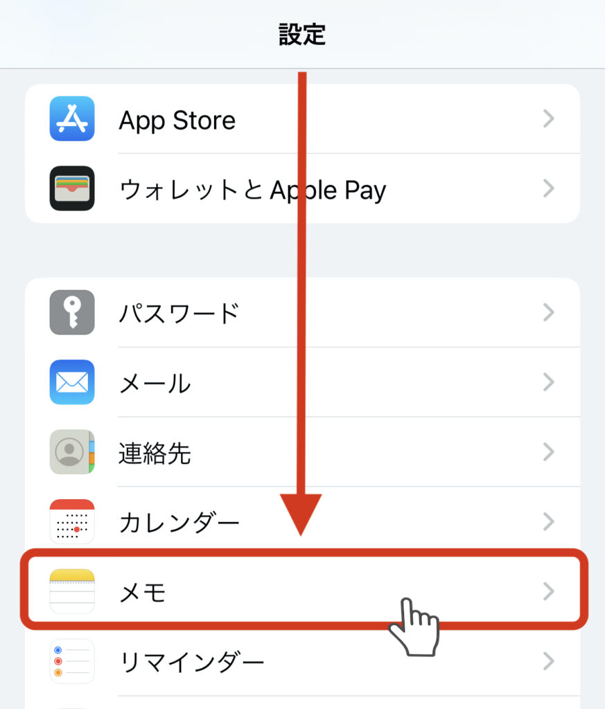 下にスクロールしていき、メモアプリをクリックします。