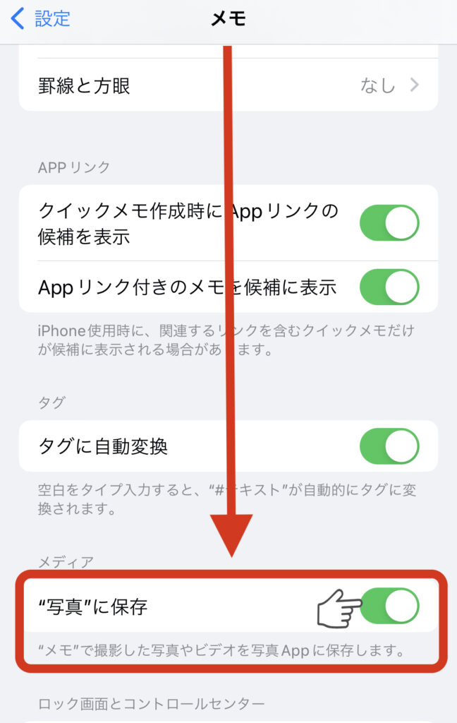 メモアプリの設定を下にスクロールしていき、「写真に保存」の設定をONにします。