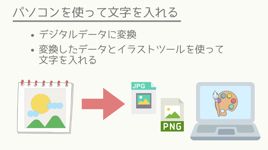 パソコンでは、イラストツール等を使って文字を入れていきますが、イラストツールはデジタルデータしか読み込むことができません。