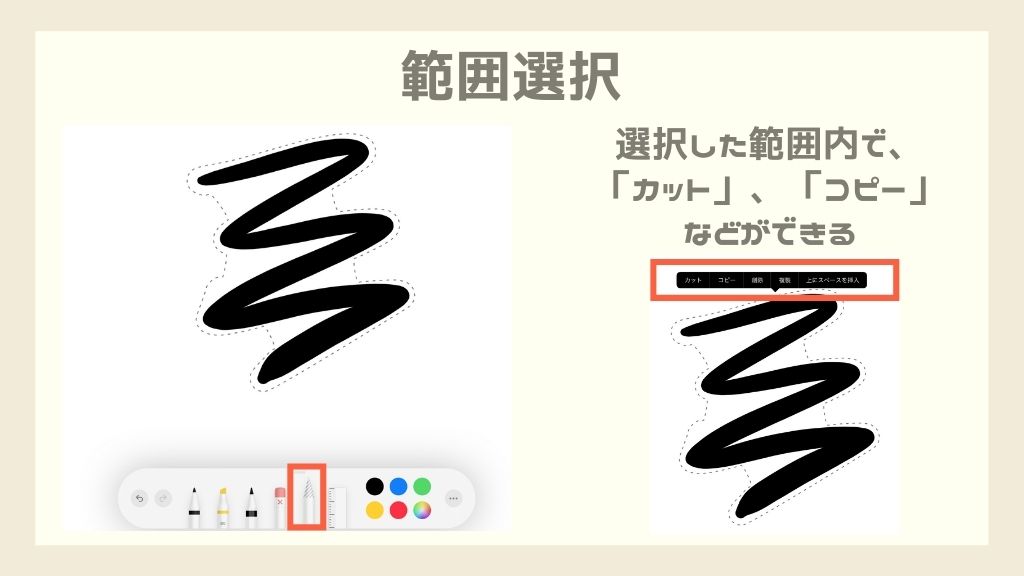 選択した範囲内で、「カット」、「コピー」などの操作ができます。