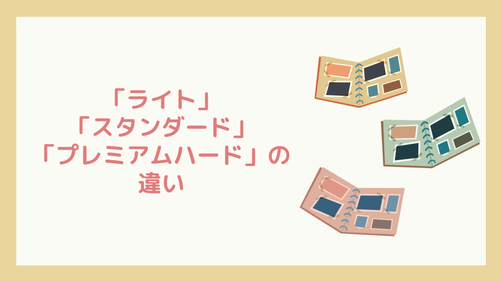 しまうまプリントのフォトブックには、「ライト」、「スタンダード」、「プレミアムハード」の3つの種類があります。