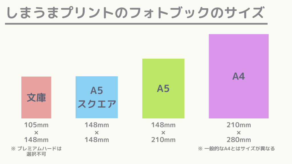 しまうまプリントのフォトブックは、「文庫」、「A5スクエア」、「A5」、「A4」の4つから選ぶことができます。